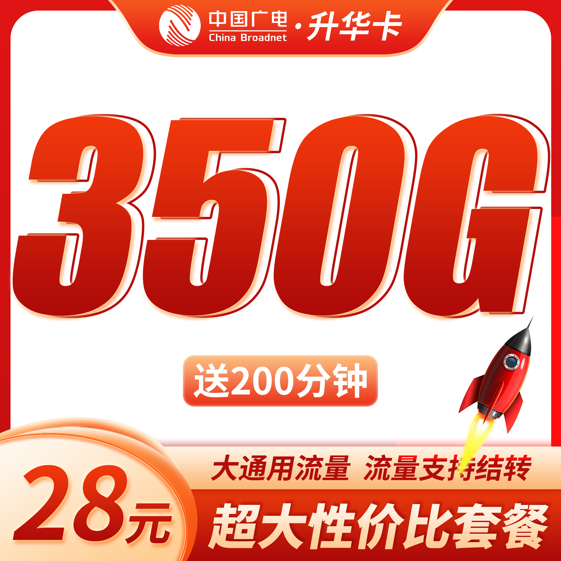 广电升华卡28元350G全国流量+200分钟通话+可结转流量!